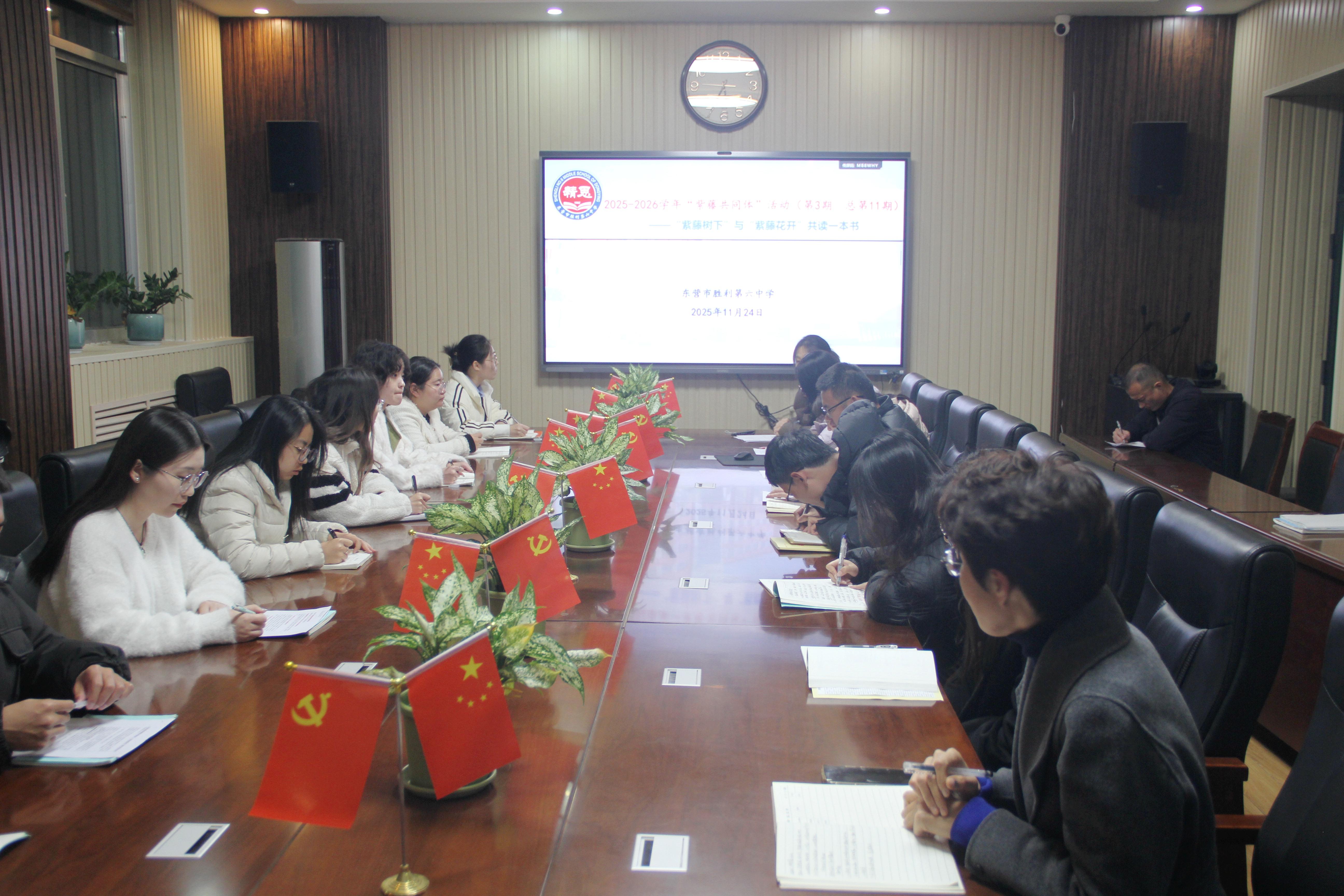 鲁网11月28日讯为充分发挥市青年骨干教师重点培养对象的示范引领作用,助力新入职教师在阅读中滋养心灵、汲取成长力量,提升教育教学能力,11月24日,东营市胜利第六中学组织开展2025-2026学年“紫藤共同体”(第3期,总第11期)——“紫藤树下”与“紫藤花开”共读一本书活动。活动由学校教科室主任郭倩倩主持,学校领导、青年教师共计30人参加。